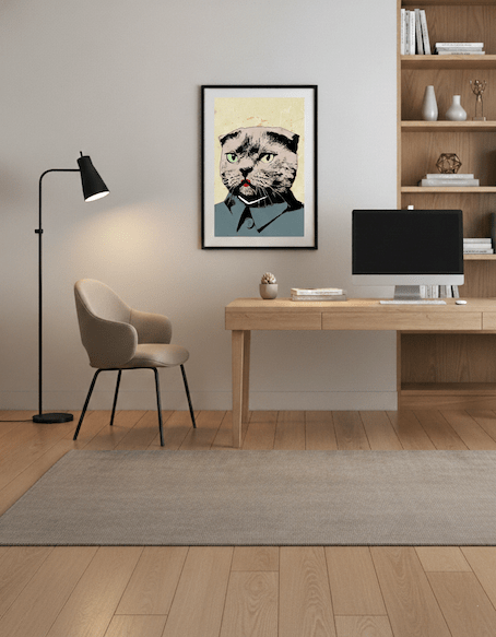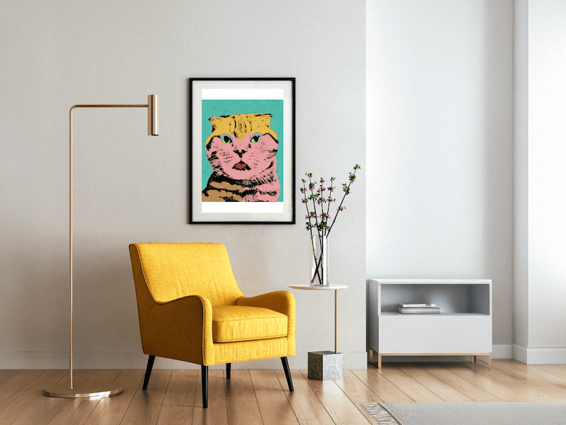 ニンゲンの画像を猫に置き換えると、元画像に似せるのは簡単ではないのです。加工しすぎると猫の個性が消えてしまい、猫そのままだとウォーホル風に見えません。猫の顔は残して、ウォーホルにも見える線を狙うため、悪戦苦闘しました。ちっともミャリリンに似てませんが、大事なのは雰囲気です。雰囲気なのっ!!