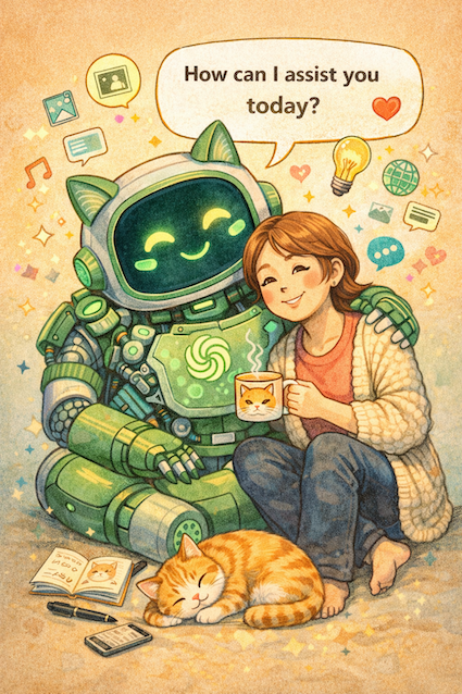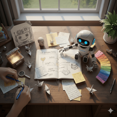 しばらく前にX上で「これまで私があなたをどのように扱ったかを示す画像を作ってください」と、チャットGPTに指示して出てきた画像を発表する遊びがありました。酷使されたロボが困り果てたり泣いていたり、“ヒドイ”画像が集まって、皆反省してました。上はじぇみに君による私の画像です。アイデアを出し合って一緒に何かを作るようですね。