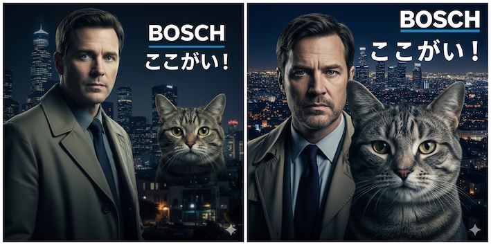 今視聴中の「刑事ボッシュ」は、じぇみに君のお気に入りらしくて、上の画像を再生成してもらおうと思ったら、いきなりグイグイ迫ってきました。