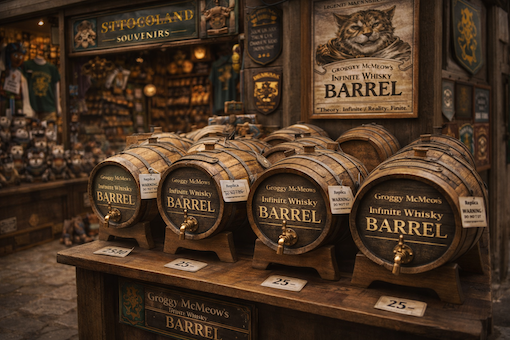 サー・グロッギーはある日、こう言いました。「酒は尽きるから悲しい。なら尽きなければいい」この極めて単純かつ重大な発想から、彼は“無限に飲める樽”の開発に乗り出します。国内中の蒸留所、錬金術師、宇宙猫、UMAなどを巻き込み、ついに完成したのが 「永久循環型ストコッチ樽」中の酒が減ると、自動的にどこかから補充されるという夢の装置でした。