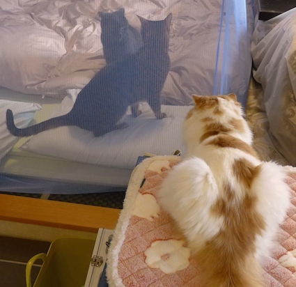 オス同士の小競り合いを見守ります。(冬でも蚊帳を吊っている理由は「宇宙人現る」で)