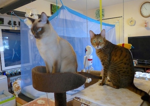 わざわざ蚊帳を吊って寝ている我が家では、キャットウォークを作るなどという恐ろしい計画は考えられません。高い所から顔めがけて猫が飛んで来る恐怖は、猫飼いの皆さんならお分かりになると思います。ママは額から血を流していたのに気付かず、宅配を受け取りに出た事があります。目の上にコブが出来ていた時もあり、どんな家庭だと思われたでしょう。