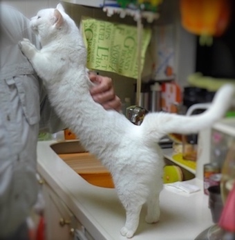 先に起きたパパがキッチンでグァバ茶を飲んでいると、走って来たボンにゃんが立ち上がってスリまくり「ととちゃま! 抱っこ抱っこー」