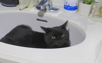 足元にはダンちゃん、洗面ボウル内にバンちゃん、大変です。