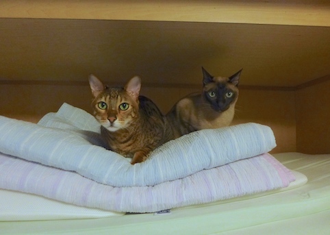 洗ったお布団をしまう時は、猫達の“お手伝い攻撃”との戦いです。布団袋に一緒に入ろうとする者・他の箱を物色する者・押入れの奥に探検に向かう者。特に押入れ探検隊は、誰か引きずり出されても、またすぐに別の者がチャレンジする繰り返しで、ママひとりで猫達の旺盛な探究心に、対抗するのは大変です。(物を)しまうのと(猫を)出すので、2倍の手間がかかります。