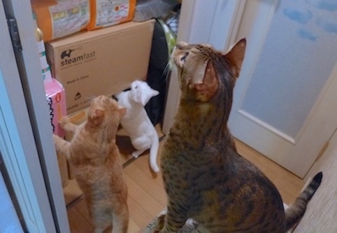 やっと終わったと思っても、必ず点呼をして確認しなければなりません。大抵は押入れの奥深くで、息を潜めて隠れている奴が居るのです。いい加減な点呼から2時間も経過してから、他の猫達の“指摘”で馬鹿者の存在に気付きます。