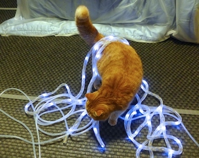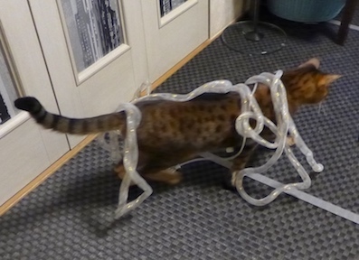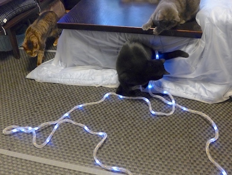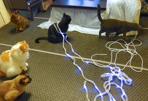 イルミネーションの季節ですね。ママはピカピカ光るものが大好きなのに、ウチには電気コードをかじるアホ猫達がいます。飾り付けの前に、全てのコードにスパイラルチューブを巻いて、ガードしなければなりません。でもこの作業が、猫のいる家では大変なのです。