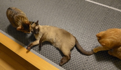 「家のニンゲンに見られたらどうするのだ!」「グルル殿下こそ目が宇宙仕様に戻っちゃってますよ」