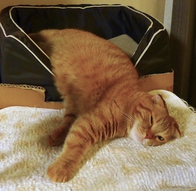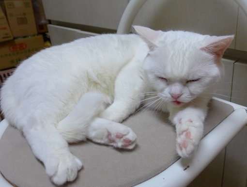 お口直しにキッチンの椅子で寝ているボンにゃんをご覧下さい。よく見ると舌がちろっと出たままです。