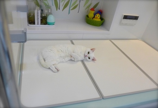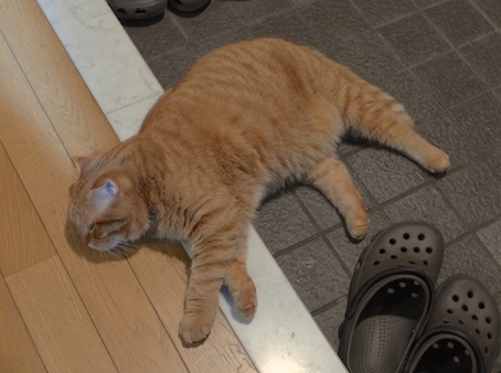 玄関に移動してタタキでクールダウンします。「尻が冷てぇだよ」