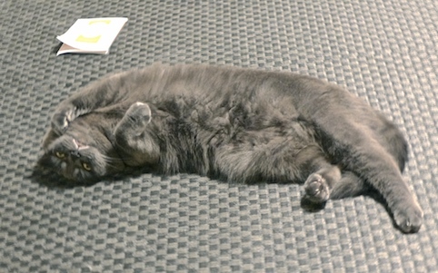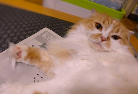おデン様は新聞の上で休んでおられますが、ママがどいてほしいそうです。「なに? 乳母がこの敷物を使うのか?」