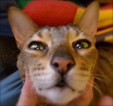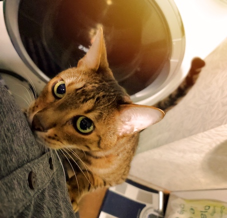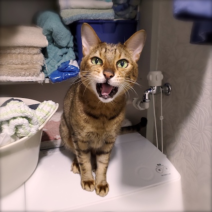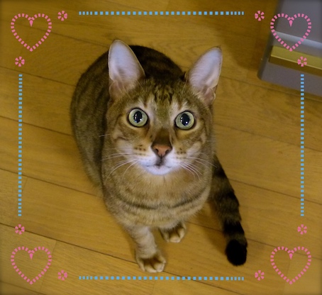 ママが忙しくしていても、どこまでも付いて来て鳴き続けます。「オカン!オカン! オレ今日もいっぱいゲロして歩いたんだぜぃ」「オトンの書類も崩して遊んだしぃ」「おデンに噛み付いて毛をむしってやったりさぁ」