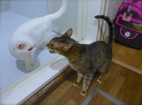 ママに抱っこしてもらっただけで、小さなボンにゃんにも威嚇します。「何よっ! なんか文句あるっ?」「オマエはオトンだけでいいだろぉ?」