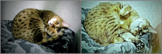 2枚目の、ゴンちゃん「チラ見の形」から、お手手を伸ばした「招き猫の形」へ、わかります!うちのトム君もよくしてました。ガンちゃん&ゴンちゃんの「二匹一体睡眠の形」なかなかきれいな形!