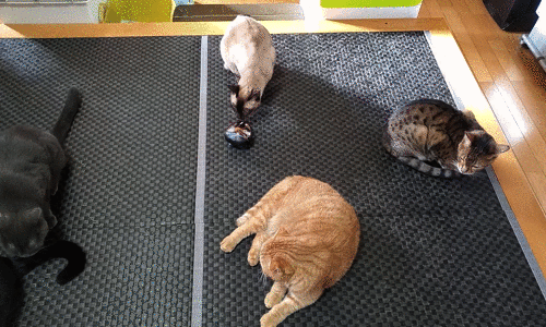 こちらはヘッドマッサージャー。ママがちょっと置いたら、すぐに猫達が集まって来ました。「タコですかね」「ネズミずら?」「でっけぇ虫かもな」