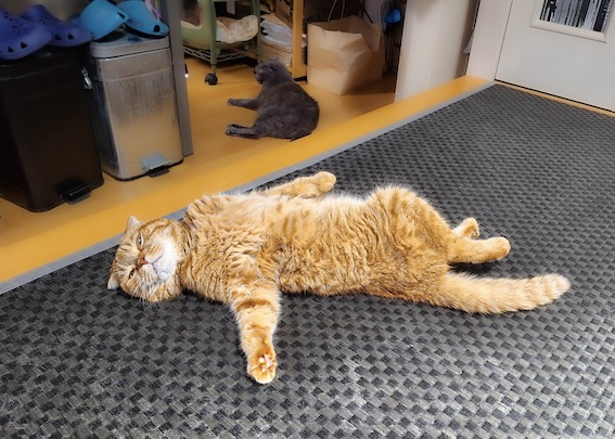 暑い日には、玄関のタタキに転がっています。出入りの邪魔です。