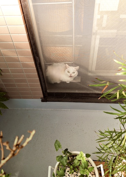 ベランダの植物達はなかなか回復しません。ボンにゃんが中から見守っています。「かかちゃまのお世話が下手なんじゃない?」