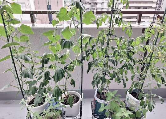 ミニきゅうりとミニトマト、いい感じに育っていますね