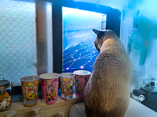 その頃ガンちゃんは、キッチンの窓にワームホールを繋ぎ、異世界と交信しようとしていました。工事の足場がある間は設定できなかったのですね。でもコレやると、Wi-Fiが不安定になるってママが怒ってたわよ。