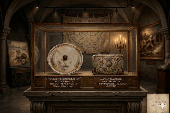 1. 左側のプレート:伝説の鍋の蓋:宇宙猫との戦いで、盾の代わりに台所から持ち出されたとされる伝説の防具