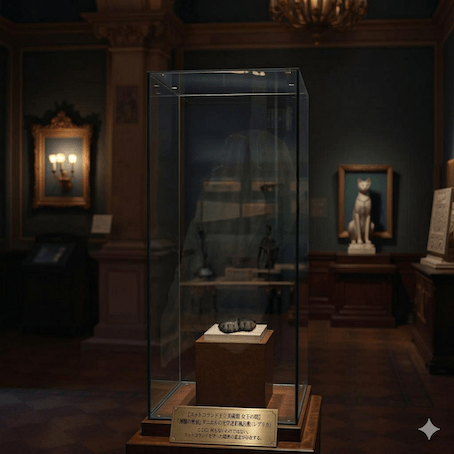 このケース内には、宇宙猫からもらったと伝わる光学迷彩風呂敷(レプリカ)が展示されています。風呂敷は完全に背景に溶け込み、肉眼では捉えることができません。 たまに生じる空間の「揺らぎ」こそが、その存在の証明です。