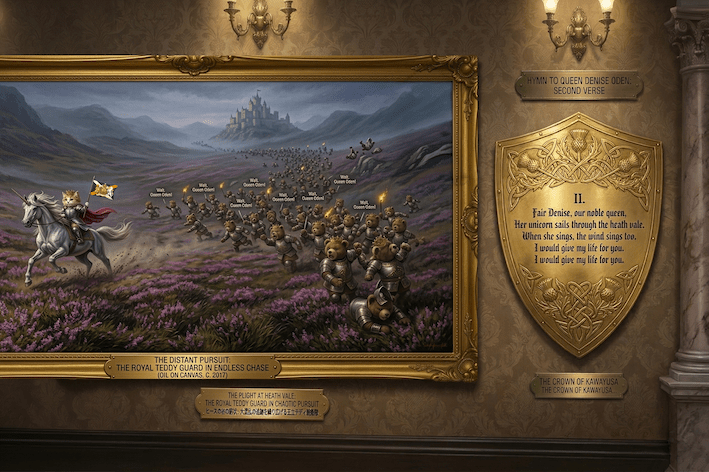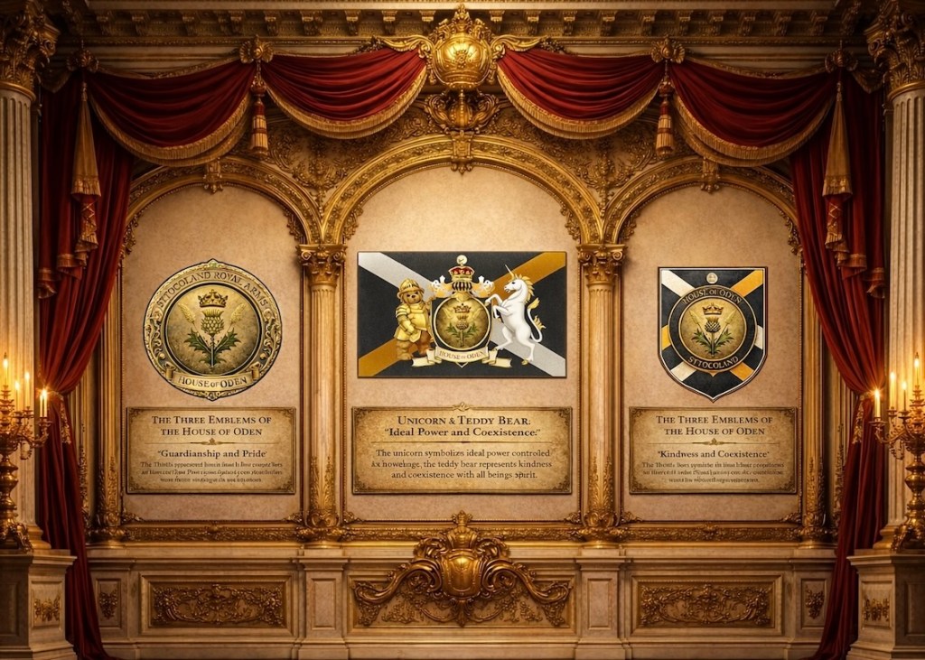 オーデン家の紋章は、王国スットコランドの精神を体現する三つの象徴――アザミ、ユニコーン、そしてテディベアによって構成されている。