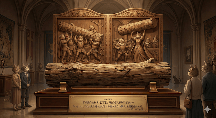 - 中央の台座に鎮座するのは、女王が軽々と持ち上げ、並み居る力自慢たちを絶望(あるいは心酔)させたあの丸太です。