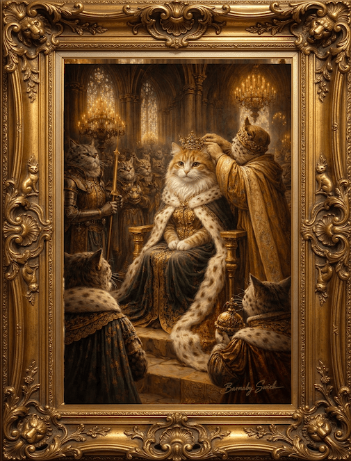 Seated with composed dignity at the center, the Queen receives her crown beneath the vaulted light of a cathedral-like hall, surrounded by nobles, clergy, and witnesses of uncertain reliability.The artist’s characteristic style is evident in the dramatic lighting, the excessive attention to ceremonial detail, and the subtle inclusion of elements that may or may not have been present at the event.