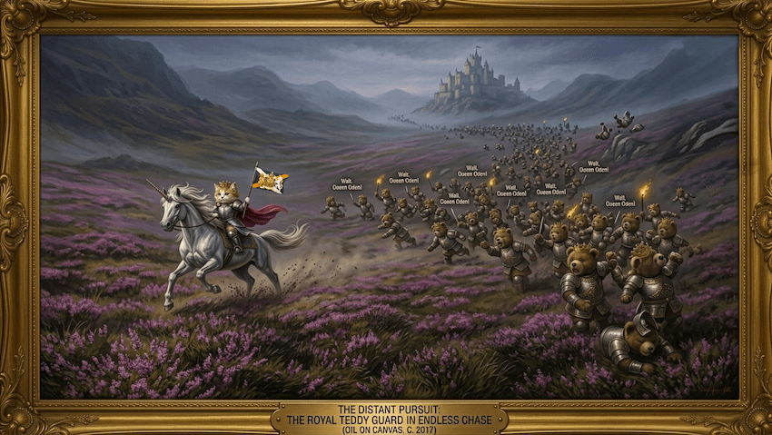 『THE DISTANT PURSUIT: THE ROYAL TEDDY GUARD IN ENDLESS CHASE』 (遥かなる追跡:果てなきチェイスを繰り広げる王立テディ親衛隊) (OIL ON CANVAS, C. 2017) (キャンバスに油彩、2017年頃)