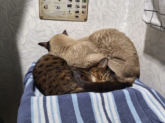 お手伝いはしないよう言い付けられている猫達は、いつものようにのんびりしています。寒い日はくっついて眠るのが良いですね。