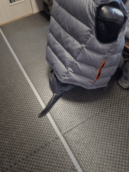 パパのダウンベストに、尻尾が生えていますが、ママは素通りです。「拙者はおりませぬよ」コバンは居ないのですね。