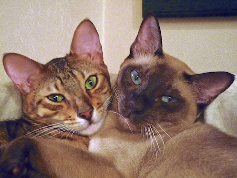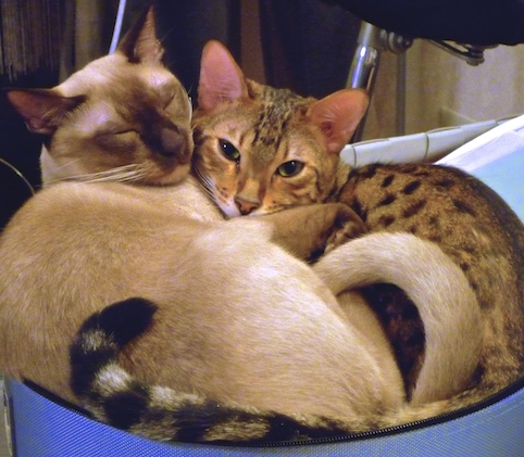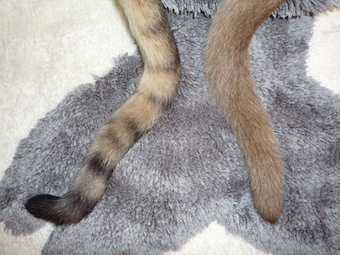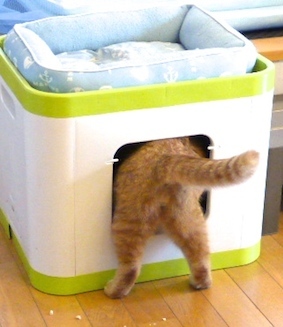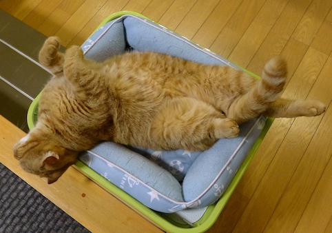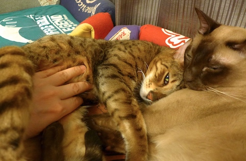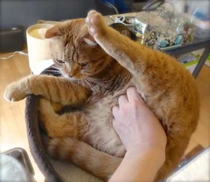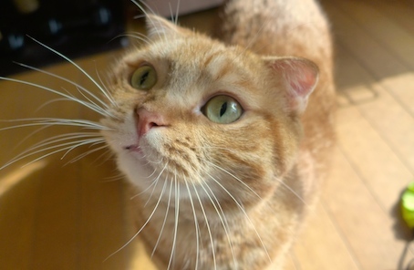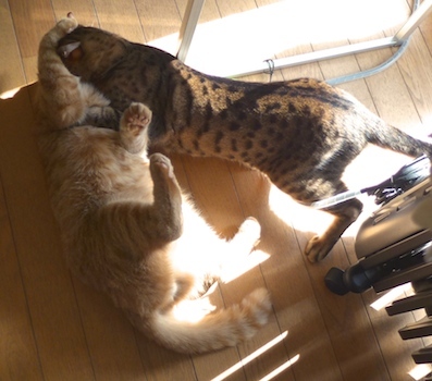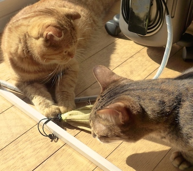 ワンちゃんのようにクリッカー訓練をする方法もあります。噛んでいる猫が口を離した瞬間に、クリッカーを鳴らしてオヤツをあげます。噛むのを止めると褒めてくれると判らせるのです。(多頭飼いだと一匹だけ分離して教えるのが難しいの) どちらの方法も頭のいい子なら数週間で、ドンごろーの場合は一年以上かけてママがしつこく教えました。
