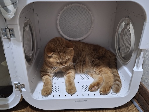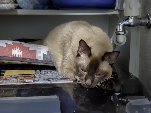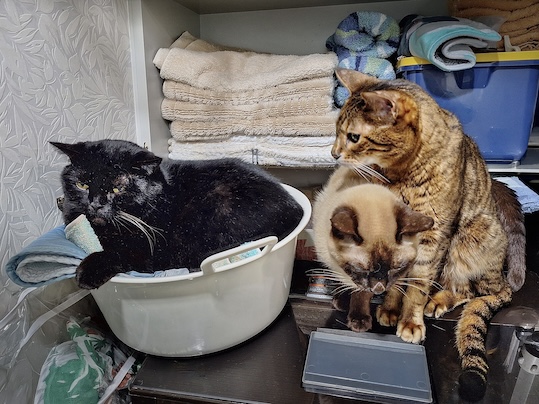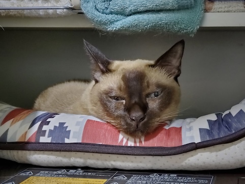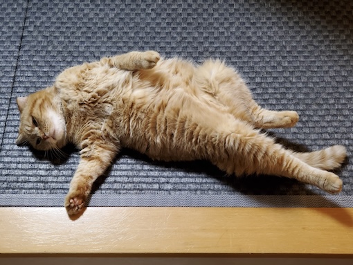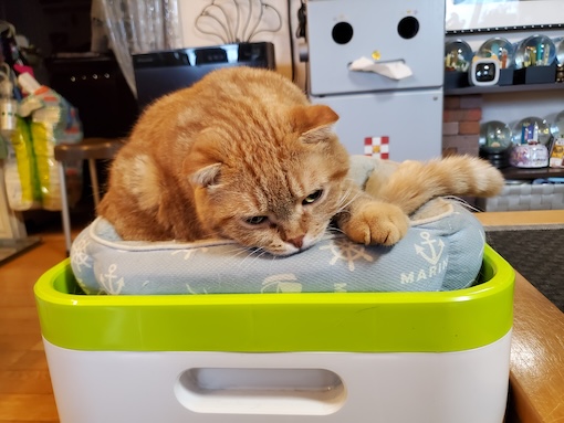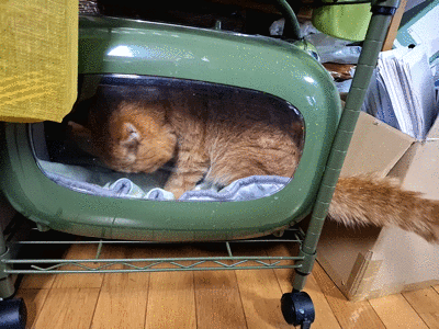 一方ガンちゃんは、オイルヒーターの上に乗るので困ります。肉球が低温火傷しそうで、物干しスタンドを置いて上がれないようにしようと思ったら、器用に隙間を歩いて座り込みます。