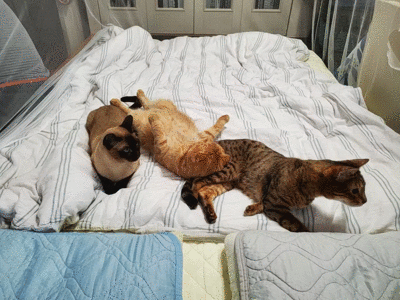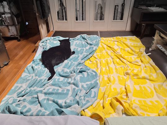 以前からあちこちマーキングをするヤツですが、お布団に繰り返しスプレイするようになってしまったので、対策しました。ベッドガードを上下逆に敷布団の下に差し込み、掛け布団の上の「おねしょ用防水シーツ」の、四隅の留めゴムを掛けて外れないようにしておきます(布団横から出ている黒い棒がベッドガードの足部分)こうしないとゴンのせいで、安心して眠れません。