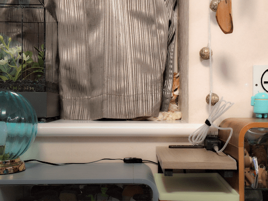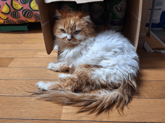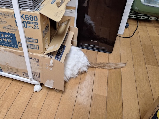 捕まって洗面所に連れて行かれましたが、途中でまたお逃げになりました。これで隠れているつもりのご様子です。