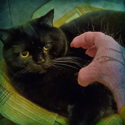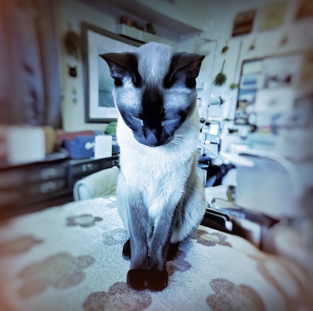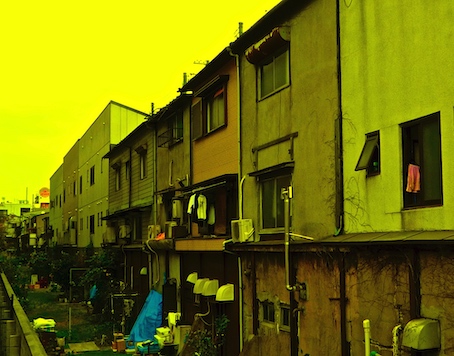課題がスクエア指定なので、真四角にカットしてから、Lightroom Classicで、上を囲んでいる円形ライトの照度を落とし、小屋の屋根と目の形のネオンの照度は上げます。上部左右の角を暗くし、屋根の上の煙はハッキリ見えるようにしました。手前のデッキ部分の解像度も上げています。