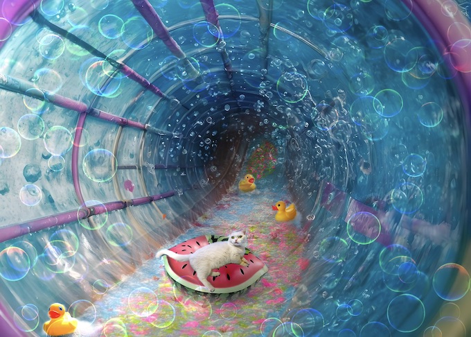 ボンにゃんも滑ってきましたよ。チューブの中が泡だらけで、ラバーダックも流れて来るのは何故なんでしょうね。不思議そうにしています。