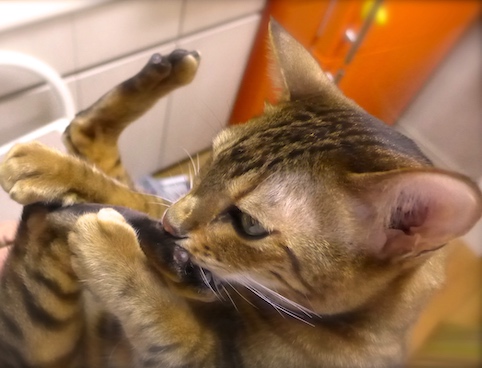 ボンにゃんは、パパ以外が近づくのを怒る子です。このように舐めてくれたりするのは、とても珍しいんですよ。ご機嫌が良かったみたいですね。
