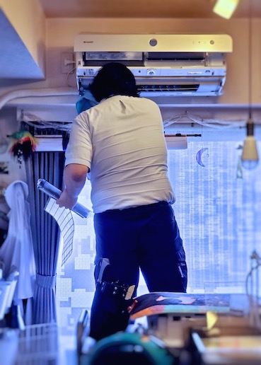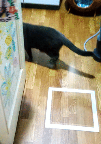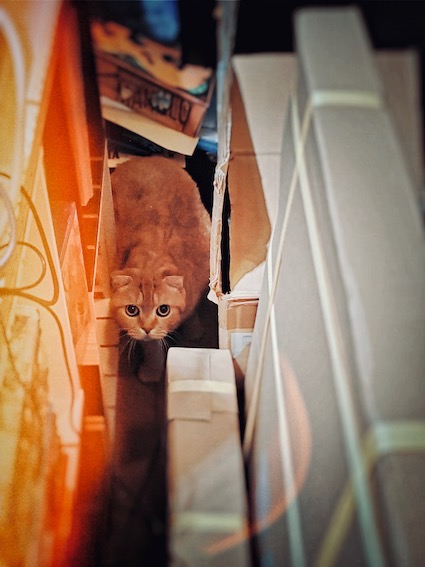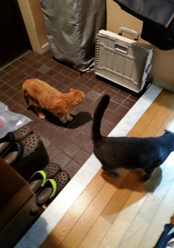 ゴンゴンが張り切って道具の匂いを嗅いでいます。エアコン修理の人が来たのです。室外機のあるベランダを見て戻ると、ゴンは交換部品の箱に登っていました。前回故障チェックしたオヂサンは撫でまくってくれたので、今回も期待してたみたいです。「遊ばね?」「オレと遊ばねっ?」今回のオニーサンはゴンを前にして固まってしまい、ママに助けを求めました。