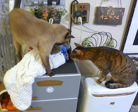 こちらにはボンにゃんとコバンの、白クマと黒クマがいますね。「この箱ぜーんぶ中身は空なのよねっ」「拙者が魔法で1円出してボンさまにあげるでござるよ」
