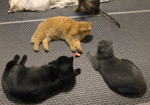 リビングでゴンゴン・おデン様・ドンごろーが、テディベアに扮して座っています。