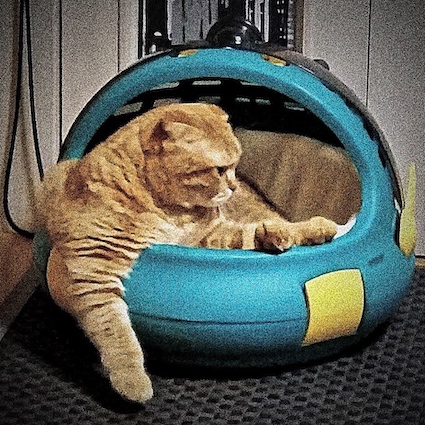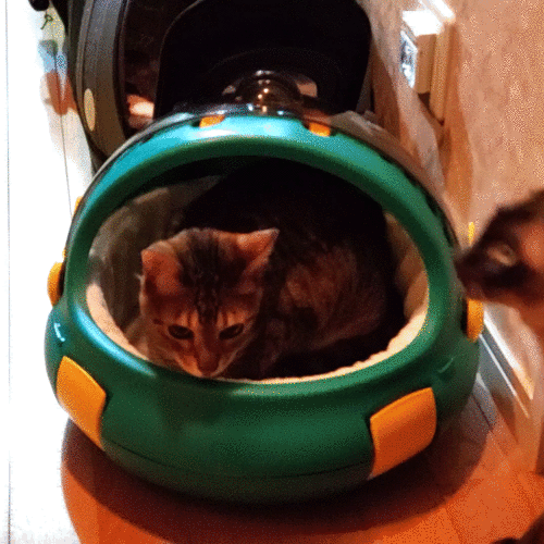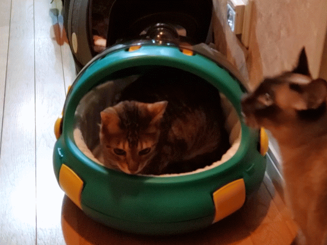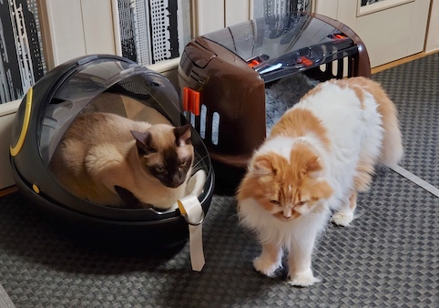 こちらではコバンが自分の新しいキャリーをチェック中。ガンちゃんは上から、不思議な覗き方をしています。