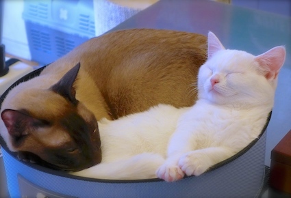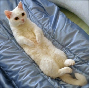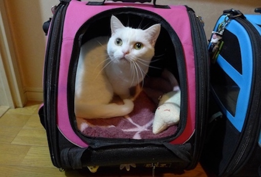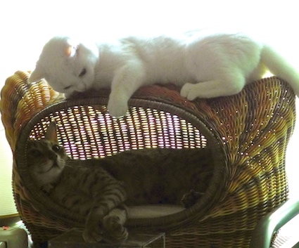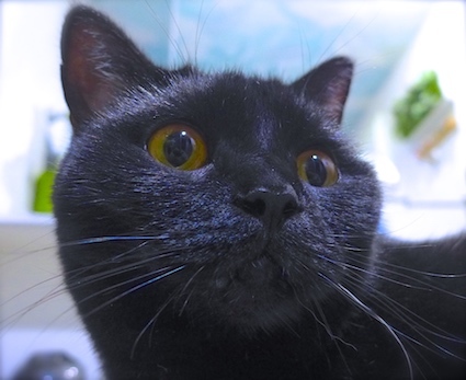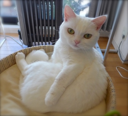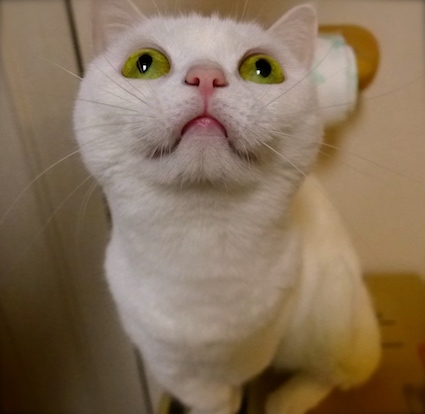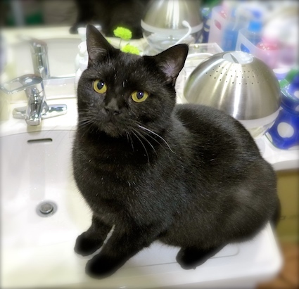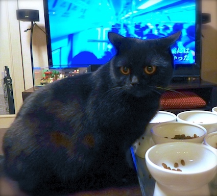 毎朝顔を洗う前に、洗面台で水を清めようとするコバンを、降ろさなければなりません。キッチンや風呂場さらにTVに映る滝なども、清めようと頑張ります。いちいちどけないと何も出来ません。しかも作業が終わって振り向くと、いつの間にか音も無く真後ろに座っていたコバンが「背中をお守りしておりました」などと言うので驚きます。ママがまたがないと自分でどく事はありません。普通の猫なら踏まれそうになれば慌てて逃げますが、コバンは動きません。