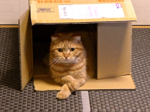 ドンごろーは、スチームモップの入っていた段ボールの方に興味があるのです。「オラは箱の調査中ずら〜」ひとりでノンキなものです。
