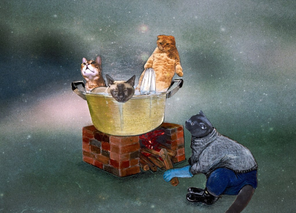 ダンゴ君は大鍋でお湯を沸かしています。「湯加減はどうですかぁ?」今年は“スットコ温泉健康ランド”での宴会が中止です。せめて露天風呂気分を味わいたいようですね。