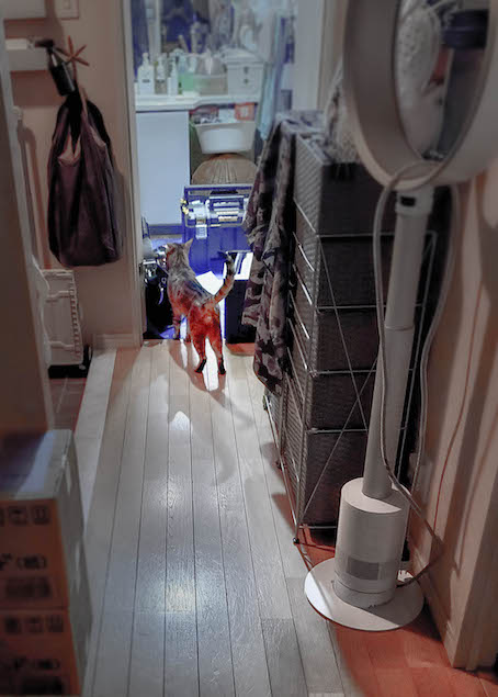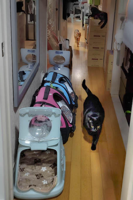 おデン様は廊下やリビングに移動した物を見て回っています。「わらわのハウスをこんな場所に置くのか?落ち着いて寝られないではないか」後で戻しますよー。