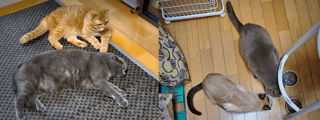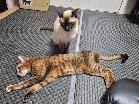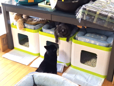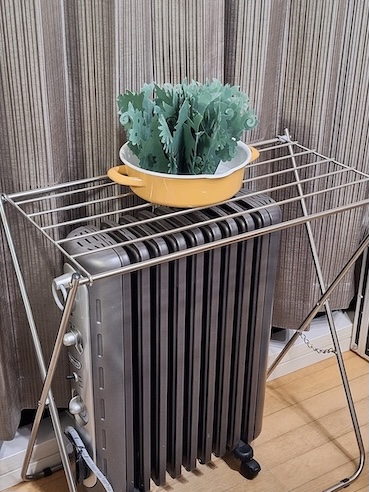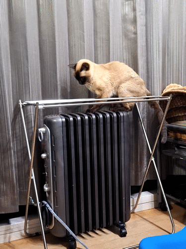 一方ガンちゃんは、オイルヒーターの上に乗るので困ります。肉球が低温火傷しそうで、物干しスタンドを置いて上がれないようにしようと思ったら、器用に隙間を歩いて座り込みます。