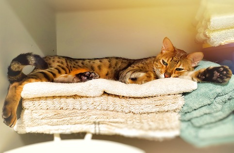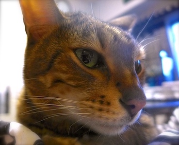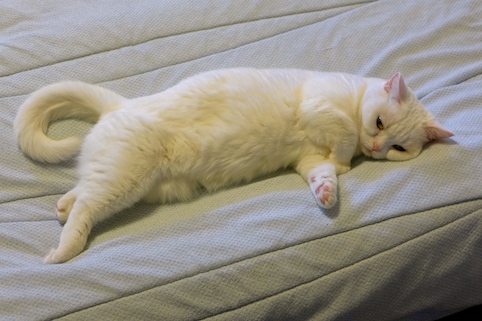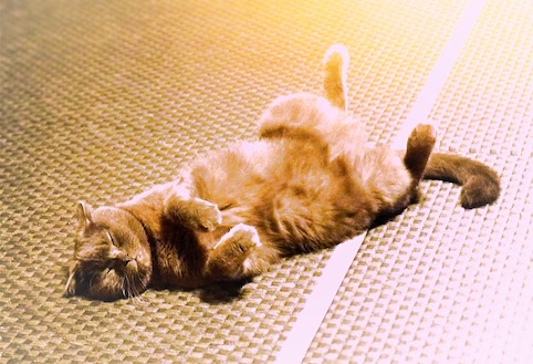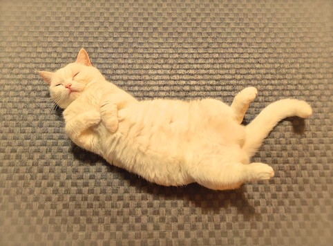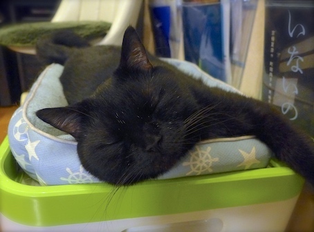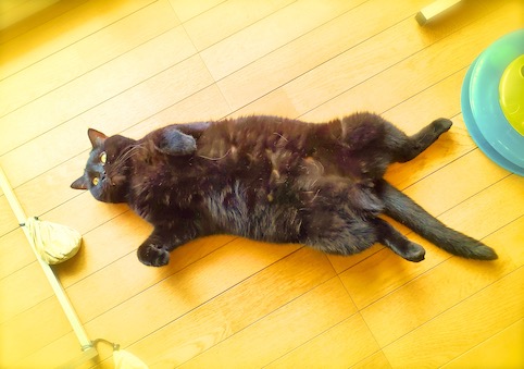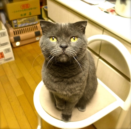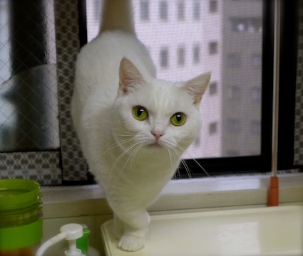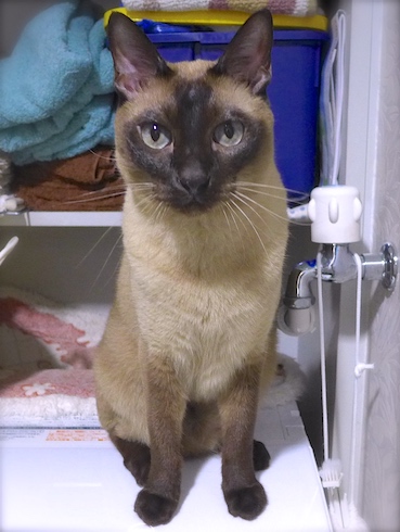 毎朝顔を洗う前に、洗面台で水を清めようとするコバンを、降ろさなければなりません。キッチンや風呂場さらにTVに映る滝なども、清めようと頑張ります。いちいちどけないと何も出来ません。しかも作業が終わって振り向くと、いつの間にか音も無く真後ろに座っていたコバンが「背中をお守りしておりました」などと言うので驚きます。ママがまたがないと自分でどく事はありません。普通の猫なら踏まれそうになれば慌てて逃げますが、コバンは動きません。
